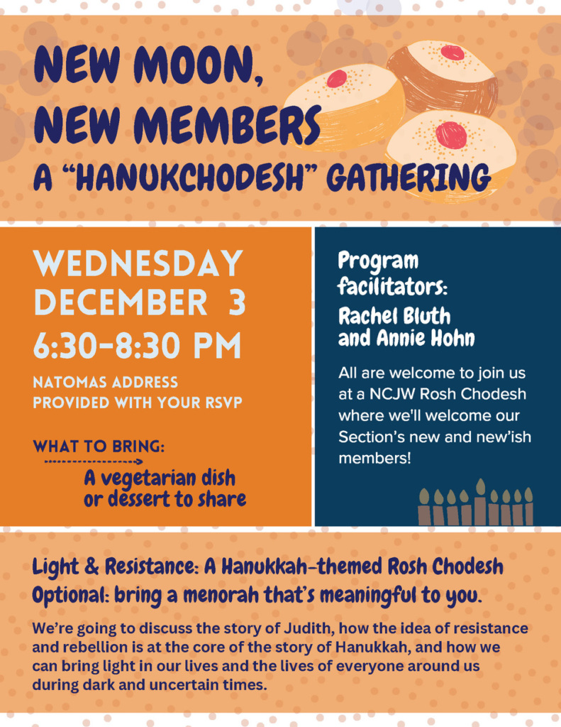 The Rosh Chodesh group gathers on the first Wednesday of every other month. Visit the Events page of our website for upcoming dates.